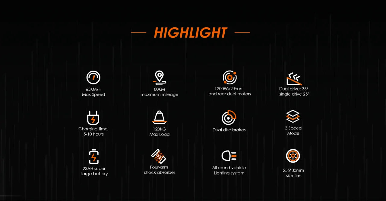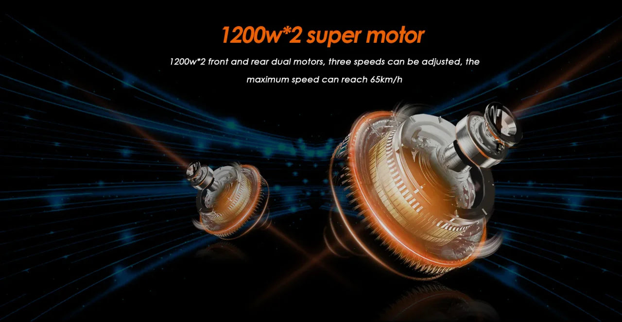 - Dual 1200W Motors: Front and rear hub motors provide strong torque and acceleration.